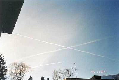 Ich hatte natürlich auf meiner Reise (Anfang März 2005) auf dem Balkan auch sehr oft den Himmel beobachtet, wegen eventuellen Sprühflugzeugen bzw. Chemtrails. In Slowenien und Kroatien habe ich keine Chemtrails gesehen, außer im Süden von Kroatien. Etwas nördlich von Dubrovnik ist mir eine sehr große Flugzeugdichte am Himmel aufgefallen. Zwischen Split und Dubrovnik wurde wirklich sehr intensiv gesprüht, und auch als ich in Bosnien war, sah ich auf kleinem Gebiet sehr viele Chemtrails! Was mir bei all diesen Flugzeugen aufgefallen ist, war folgendes: diese Flugzeuge, die eindeutig keine Zivilflugzeuge waren, sondern Militärmaschinen, kamen alle vom Staatsgebiet von Bosnien-Herzegowina aus geflogen, und meiner Meinung nach ist da die einzige logische Schlußfolgerung, daß es US-amerikanische Militärflugzeuge waren, die dort von amerikanischen Flugzeugbasen aus starteten. Während ich sonst auf dem Balkan bzw. in Südosteuropa nirgends diese Chemtrails gesehen habe, nicht in Bulgarien, Griechenland, Serbien, Slowenien, Kroatien (außer Süddalmatien). Ich habe außerdem beobachten können, als ich auf dem Weg nach Slowenien war (in Kärnten), daß dort in Kärnten sehr intensiv gesprüht wurde, sah dort auf einmal etwa 20 ( ! ) Chemtrails am Himmel, aber als die Sprühflugzeuge in Richtung Slowenien weiterflogen, machten sie seltsamerweise wenige Kilometer vor der slowenischen Grenze eine Schleife, um nicht slowenisches Staatsgebiet zu überfliegen, sondern drehten eben wieder um, um nicht Österreich zu verlassen. Ob da die slowenische Luftwaffe die immer ungekennzeichneten Flugzeuge wohl abgeschossen hätte, ging mir sofort durch den Kopf ... Seit zwei Tagen wird auch hier im Salzburger Land wieder intensiv gesprüht, es ist dabei immer das gleiche Bild, schon seit Monaten !! Die Flugzeuge kommen immer von Bayern über die Berge geflogen, in dieser Flugrichtung müßte eigentlich ungefähr München liegen, und es fliegen dann oft drei , vier oder fünf Flugzeuge eng nebeneinander mit ihrer Giftladung ... Auch heute (18.03.05) flogen sie wieder einmal den ganzen Tag kreuz und quer am Himmel ... ![]() Aufgenommen von Roland H. über