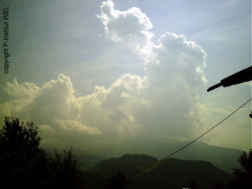 Dieses Bild wurde am 17. Juli 2009 morgens über München aufgenommen. Die Wolke (Eisbolide) hatte eine Geschwindigkeit von 60 km/h und schwebte/schoß in Richtung Nordosten. Betrachten wir den im Hagelunwetter sich kundgebenden Vorgang etwas genauer, so müssen wir zunächst im Auge behalten, daß die Atmosphäre ihrerseits wie ein elastischer Puffer wirkt und der Bolide durch Reibung seiner Oberfläche eine Abbremsung und Erwärmung erfährt. Nichtsdestoweniger wird aber seine vordere Außenhälfte vollkommen abgeschmolzen und verdampft, zumal Eis ein schlechter Wärmeleiter ist, sondern es werden Wärmeausdehnungs-Materialspannungen in seiner Außenkruste erzeugt, so daß diese sich zunächst losschält und körnig zerstiebt. Spannungsdifferenzen des Materials lassen die Schale in auseinandersprühende Teilchen zerbröckeln, die ihrerseits rasch und sich verlangsamend fallen, die langsam Wärme aufnehmen und sich reibend und anschmelzend zu rundlichen Eiskörpern, das heißt Hagel, gestaltet. Im Hinblick auf die hohe Einschußgeschwindigkeit geschieht die Eisabschälung am Boliden außerordentlich plötzlich, weitere Eisschichten schälen sich los, so daß sich der Körper mehr oder minder explosionsartig, mit noch verhältnismäßig hoher Einschußgeschwindigkeit begabt, in wenigen Sekunden zu einer Eiskörnerwolke auflöst. Diese Auslösung findet aus der ganzen Länge des Einschlagkanals in der Luft statt, und die milliardenfach zersplitterte Eismasse ist nichts anderes als eine Hagelwolke. Diese Wolke durchstößt nun in ihrer Gesamtheit die träge Luftmasse, die wie eine verzehntausendfachte Widerstandsfläche wirkt. Die kosmische Schußbewegung ist dadurch zwar aufgehoben, aber eine immerhin noch genügend starke lebendige Kraft der zahllos summierten Einzelkörperchen trotzt diesem Widerstand. Sie schiebt mit Sturmesgeschwindigkeit den Widerstand leistenden Luftbereich vor sich her, sendet sozusagen eine (zufolge der Luftelastizität sich bildende) Kompressionswelle voraus. Hierbei werden naturgemäß infolge Luftreibung auch beträchtliche, ständig sich vergrößernde Nachbarluftmassen schräg nach abwärts oder auch mehr oder weniger tangential mit in die Tiefe gerissen. So wird uns der dem Hagelschlag unmittelbar vorauseilende Sturm verständlich, der auf den von der Hagelwolke vorausgeschobenen Luftmassen beruht. Der vorausgeschobene