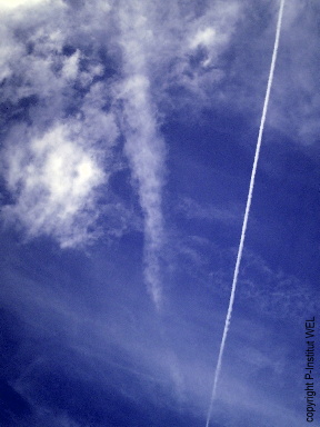 Links sehen wir eine Eiseinschußwolke und rechts einen Chemiestreifen (Chemtrail). Am späten Nachmittag gab es dann Gewitter und viel Regen. ![]() Das obige Bild wurde am 31.10.09 über Hamburg aufgenommen. Dieser Eisbolideneinschuß erfolgte schon sehr früh vormittags. Es wurden auch viele weitere Eisbolideneinschüsse gesehen. Gegen nachmittag des gleichen Tages zogen bereits Wolken auf und am nächsten Tag (1.11.09) war der ganze Tag bewölkt und spät am Nachmittag fing es heftig an zu regnen, hinzu kam noch ein Kälteeinbruch. Die Erde durchwandert Ende Oktober und Anfang November den Eisschleiertrichter (dem obigen Bericht ist eine Zeichnung beigefügt) aufsteigend und hat dadurch die Möglichkeit Eisboliden einzufangen. |