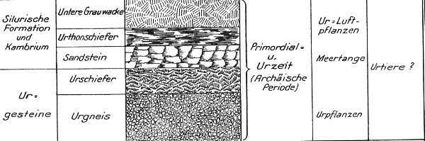Fig. I: Idealer Schnitt durch die Schichtenfolge der festen Erdrinde mit Angabe der Gesteinsarten der geologischen Zeitalter sowie des Aufstiegs der Fauna und Flora von der Urzeit zum jetzigen Zeitalter. (Die Schichten sind nur in der Reihenfolge geordnet, auf die Stärke der Schichten konnte keine Rücksicht genommen werden.) Zu oberst befindet sich eine