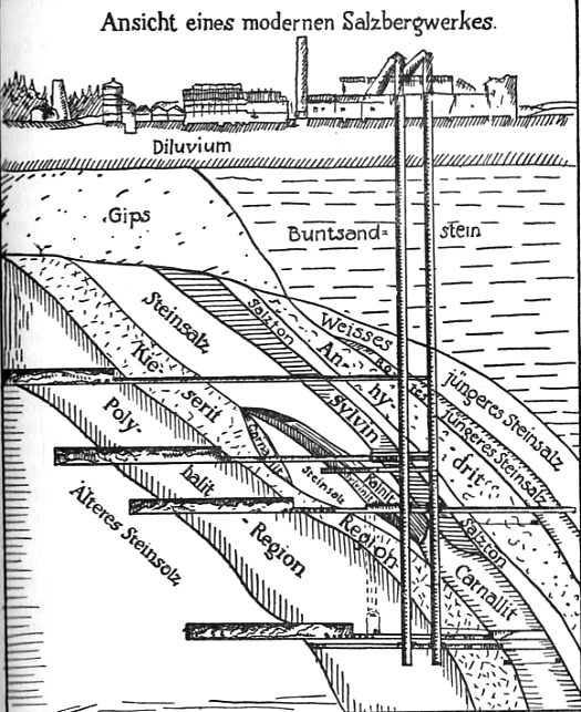 Fischer, 1925, R.Voigtländer Verlag, Leipzig) Fig. I: Idealer Querschnitt durch das Kalibergwerk zu Staßfurt. Soviel über den Aufbau