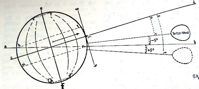 Zu den wichtigsten Abschnitten der tertiären Mondeszeit gehört das stationäre Stadium, also die Periode, in welcher der planetare Trabant nur etwa sechs (bis sieben) Erdradien von der Erdoberfläche entfernt kreiste, die Erdrotation eingeholt hatte und für längere Zeit über demselben Meridian stillzustehen schien.  Da die Achse der rotierenden Erde zu damaliger Zeit noch etwa 16 bis 17 Grad von der Senkrechten abwich, auch die Mondbahn gegen die Ekliptik unseres Planeten ungefähr 3 bis 5 Grad geneigt war (Abb. 1), befand sich der über Abessinien verankerte kosmische Begleiter nicht in vollkommener Ruhe, sondern pendelte, vom Äquator gesehen, täglich einmal nach Norden und einmal nach Süden und hatte durch die infolge seiner großen Erdnähe gewaltig gewachsenen Kräfte Gelegenheit, die planetare Achse (von 16 oder 17 Grad) bis auf 8 (7,5) Grad gegen die Senkrechte aufzurichten (1).