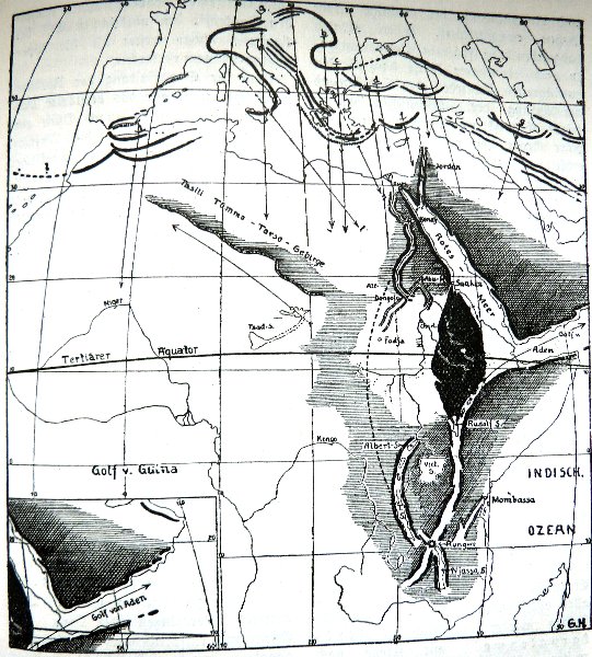 (1) Über die Entstehung des Abessinischen Hochgebirges, die Lage des tertiären Äquators, die Aufrichtung der Erdachse sowie die um die Wende des eintägigen Monats entstandenen Graben- und Flankenbrüche vgl. den Aufsatz des Verfassers "Das Zeugnis des Abessinischen Hochgebirges" im "Schlüssel zum Weltgeschehen" Jahrgang 1928, Heft 12.