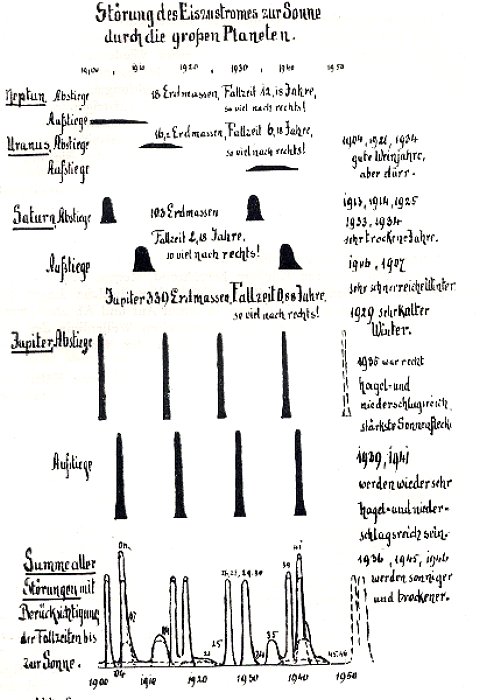 Die Jahreszeiten des Grobhagelfalles sind vorhin schon andeutungsweise gegannt; jetzt aber muß der störenden Ursachen gedacht werden. Durchfahren die äußeren großen Planeten den Eiskegel, so wirbeln sie die zur Sonne ziehenden Grobeiskörper durcheinander und fangen einen Teil davon ab. Die aus ihrer Bahn gestörten Eiskörper bilden dann den "Gegentrichter", dessen Ankömmlinge der Erde zu anderen Jahreszeiten begegnen, als diejenigen des ungestörten. Auch auf der Sonne machen sich die gestörten Eiskörper, zum Teil wenigstens, in ganz anderer Weise geltend als die ungestörten. Die Durchfahrungen der Kegelmäntel durch die Planeten, abhängig von deren heliozentrischen Längen, hat Hörbiger von 1650-1900 in Gestalt der Planetenscheibe und die Störungskurve im Vergleich mit den Wolferschen Sonnenfleckenzahlen bildlich dargestellt. Für die Voraussage des Großwettergeschehens der nächsten Jahre bringe ich zunächst die Planetenscheibe mit den heliozentrischen Längen des November 1935 (Abb. 5). ![]() Abb. 5. Daraus ist ersichtlich,
