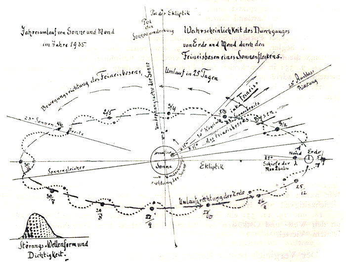 Neumond am 30. 6. 35: am 27. 6. Erdbeben in Süddeutschland; doch ist es fraglich, ob es mit Feineisanblasung oder mit Erdnähe des Mondes etwas zu tun hat. Neumond am 30. 7. 35, mit Sonnenfinsternis, vom 28.-31. 7. 35 Vorübergang eines tiefen Sturmwirbels, 28., 29., 30. schwere Regenschauer, namentlich am 28. 7. 35. Neumond 29. 8. 35: am 27. 8. schwere Gewitter mit schwerem Regen. Neumond 27. 9. 35: früh am 25. 9. tiefer Barometersturz, bis zum 27.9. anhaltender Sturm bis Windstärke 8, furchtbarer Sturm in der Nordsee und an deren Küste, Taifun in Japan, Rückfall-Regen und Hagel in Abessinien, Zyklone in Florida und Havanna. Am 12. 10. 35 Vollmond, 8. 10. Erdbeben in Mittelasien, 10. 10. großer Wettersturz über England mit schwerem Sturm und mit Kaltluft, gewaltigem Regen, stellenweise mit Hagel untermischt, gewaltige Gebäudeschäden, Sender zu Langenberg umgeweht, Bäume entwurzelt und dergleichen. Am 10. 10. Mondring, auf Eisnadeln zurückzuführen. Auch ohne Mondraffung traf uns zur Zeit des nahenden, letzten Mondviertels ein Feineisbesen und führte herbei: 18./19. und vom 19./20. 10: Sturmwirbel; letztere hielten noch bis zum 22. 10 hin an und verursachten an den Nord- und Ostseeküsten gewaltige Schäden, Uferabbrüche und Stauungen der Flußmündungen. Zu gleicher Zeit auch Orkane auch über den Antillen und in Mitteleuropa desgleichen in Süddeutschland; dann trat Kaltluft in Schweden und Deutschland auf. 22. 10 Wolkenbrüche über Mazedonien, Jamaika und Kuba, Erdbeben in Kleinasien und Montana (USA). Das alles anscheinend ohne besondere Mondeinwirkung; es deutet auf Dauerwirkung einer großen Fleckengruppe und zeigt daher Wirkung auf der ganzen Erde. Neumondwirkung wurde erneut